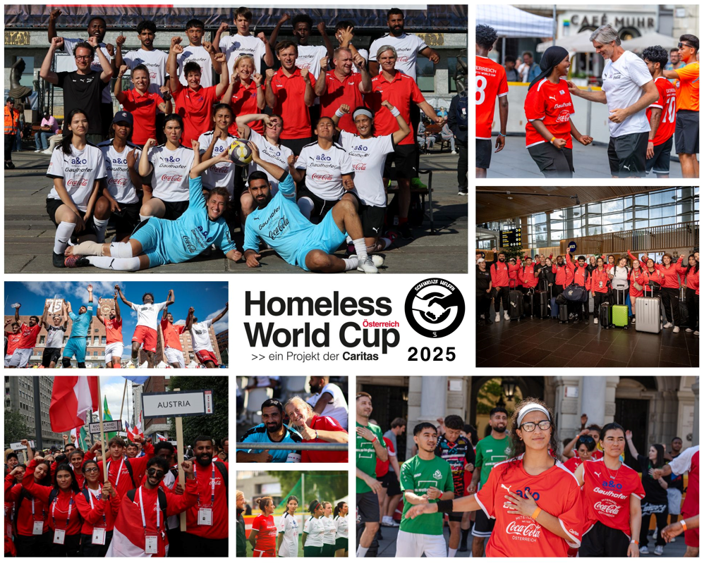 - Homeless World Cup Österreich – 5.000€: Erstmals haben wir bei Schwoaze Helfen 2025 den Homeless World Cup unterstützt. Eine Veranstaltung, die 2003 in Graz das Licht der Welt erblickt hat und Obdachlosen einen erfolgreichen Weg bietet, aus ihrer sozialen Isolation herauszutreten. Dank eurer Unterstützung konnten wir dem Homeless World Cup-Team Österreich regelmäßige Trainingseinheiten und die Abhaltung von Trainingslagern und Workshops zur Vorbereitung auf das jährliche HWC-Turnier in Oslo 2025 ermöglichen. Ebenso wurden durch besagte 5.000€ anschließende Reflexionseinheiten mit den Spieler*innen und dem Trainerteam sichergestellt. Weitere Infos zum Homeless World Cup findet ihr in unserem Eröffnungsbeitrag zu Schwoaze Helfen 2025 sowie auf deren Website. Dort gibt es außerdem wunderbare Impressionen vom Turnier in Oslo, bei dem die österreichischen Frauen erst im Finale des City of Oslo-Cups an Tansania und die österreichischen Männer ebenfalls erst im Finale des GateFootball-Cups an Argentinien scheiterten. Impressionen zum Homeless World Cup 2025 gibt es HIER sowie in der nachfolgenden Bildcollage, die uns HWC Österreich zur Verfügung stellte.