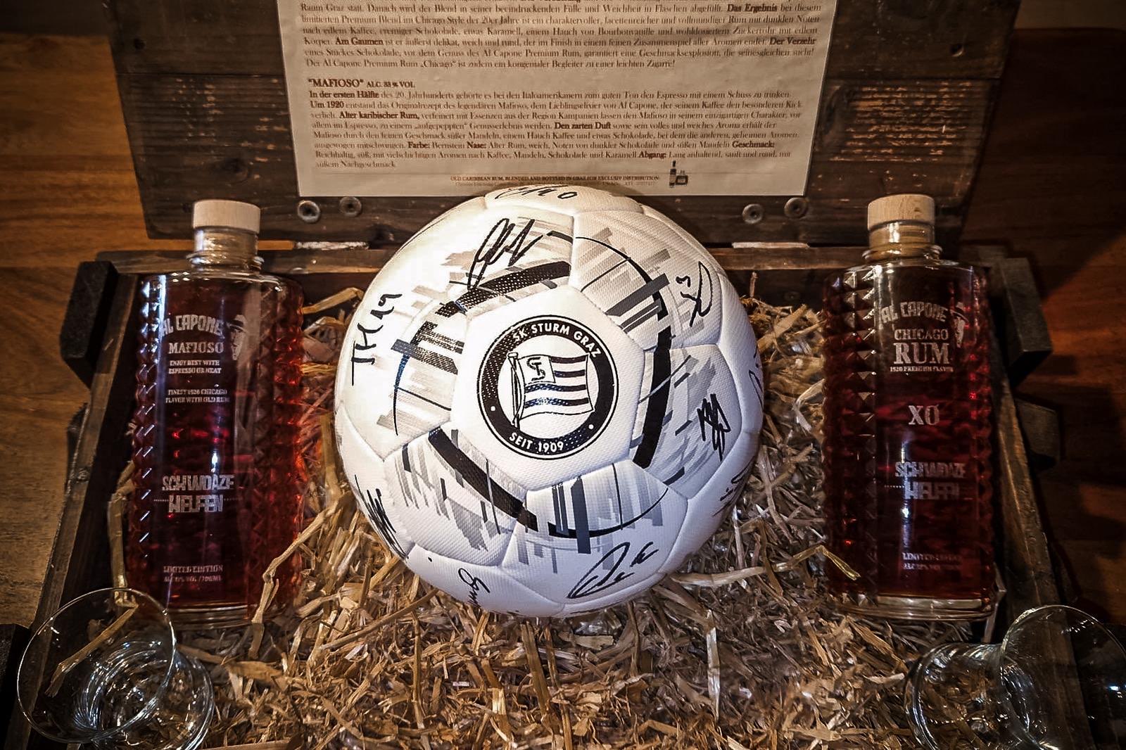Im Mittelpunkt steht ein nagelneuer Sturm Graz-Matchball mit den Unterschriften aller Spieler des SK Sturm Graz. Ergänzt wird das Set durch zwei für Schwoaze Helfen gebrandete Einzelstücke der Firma Al Capone Premium Rum: