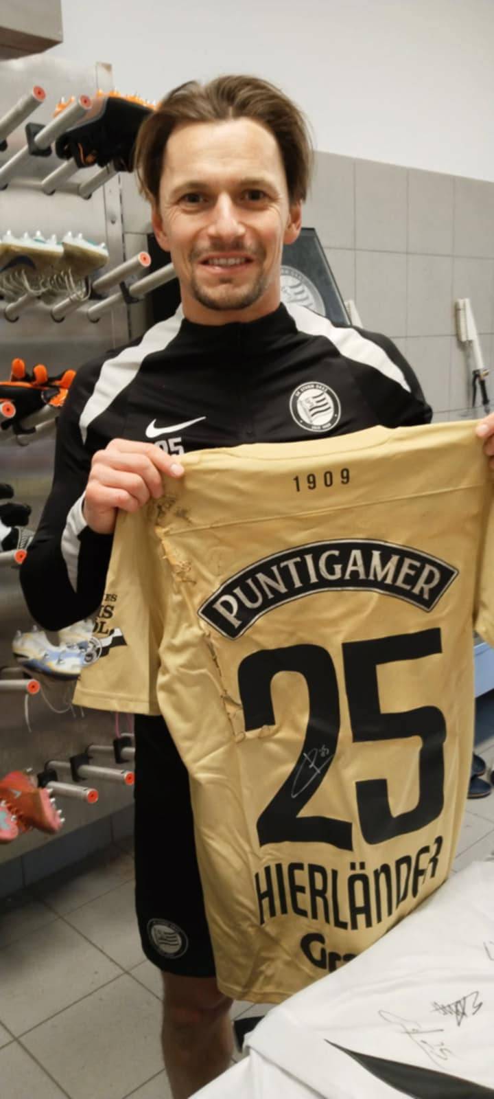 Signiertes Trikot von Stefan Hierländer, gerettet aus dem Brand in Messendorf. Zur Verfügung gestellt von Mario Sommer. Persönliche Übergabe durch ihn inklusive Führung durch seinem Trikotraum.