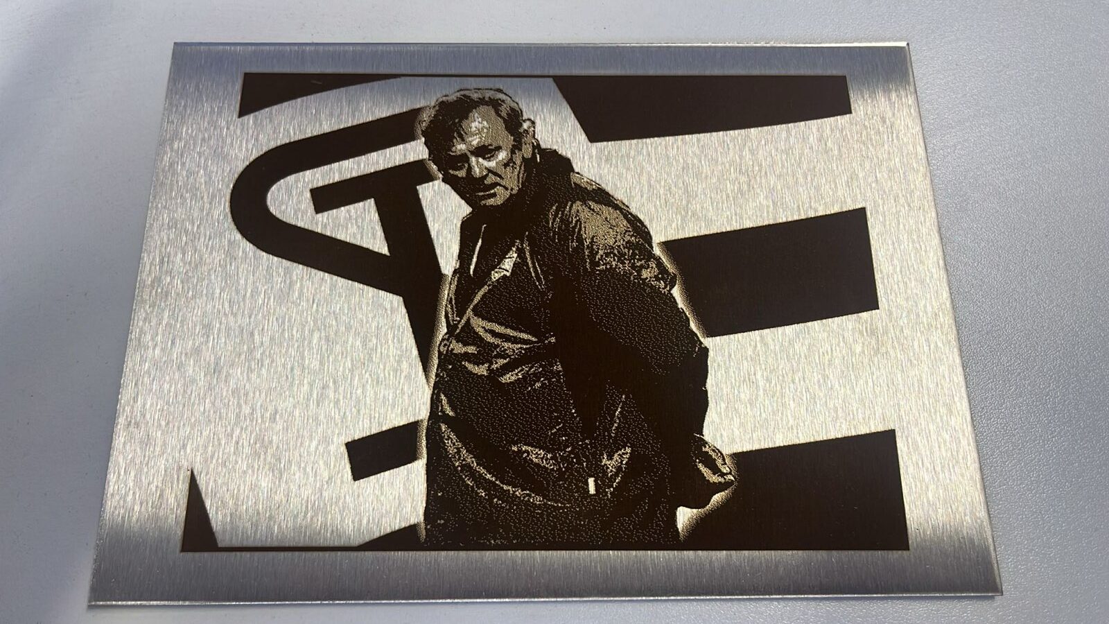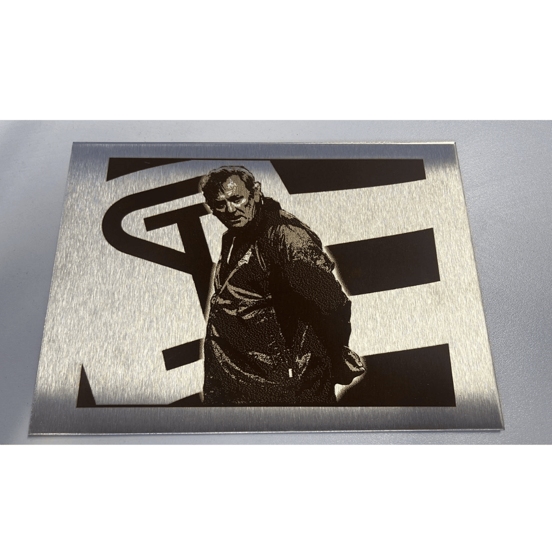 Graviertes Metallbild von Jahrhunderttrainer Ivica Osim mit der Sturmfahne im Hintergrund.