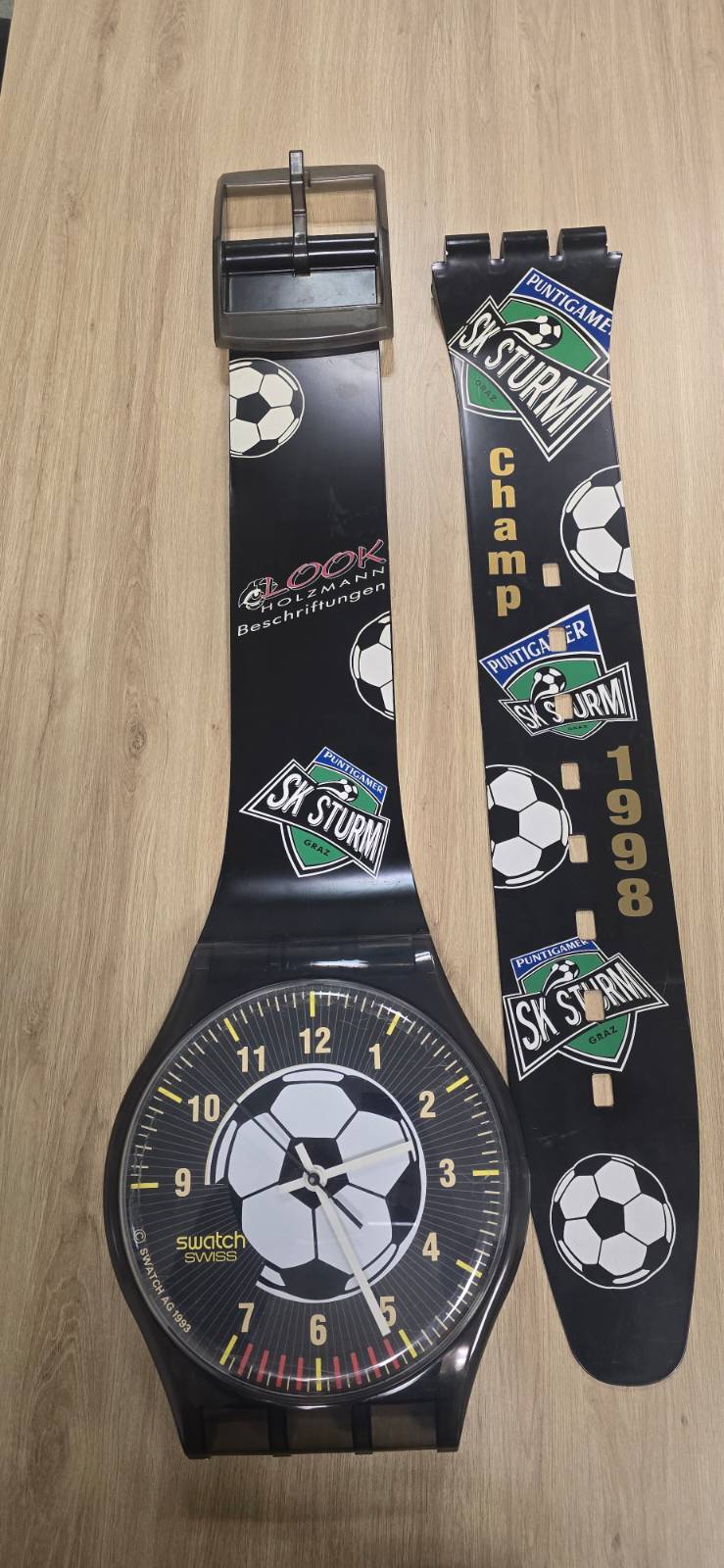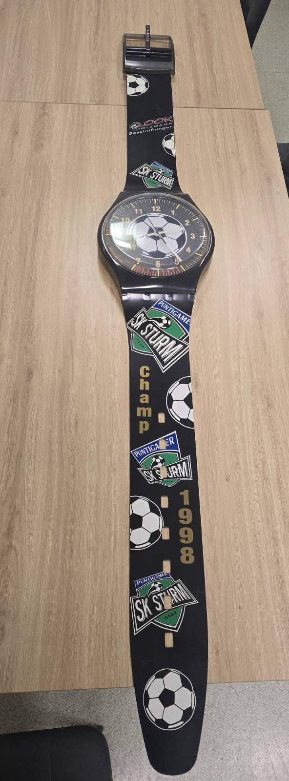 Eine SK Sturm-Armband-Wanduhr aus dem Jahr 1998 im legendären und kuriosen Champ-Design!