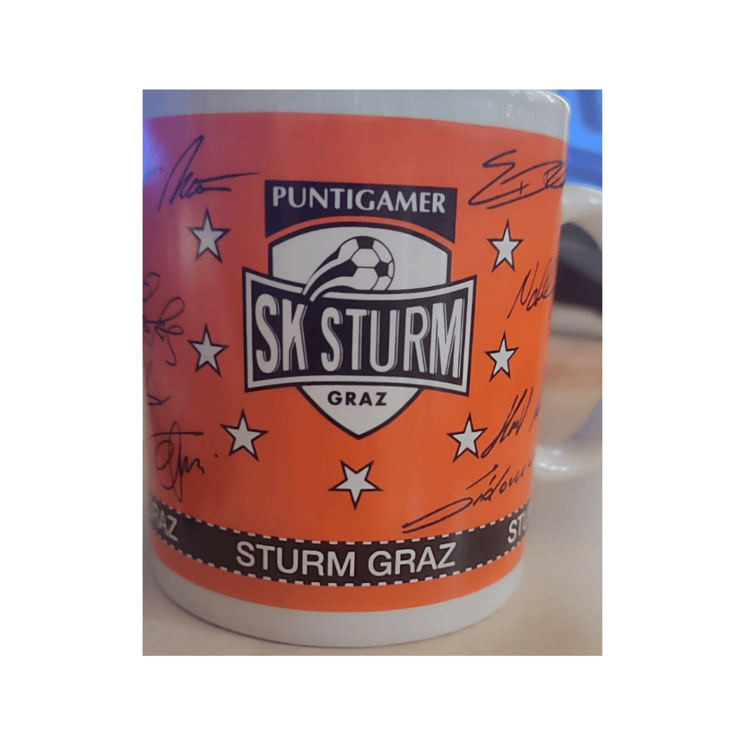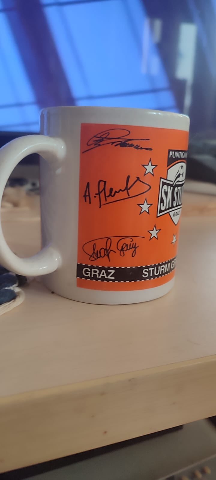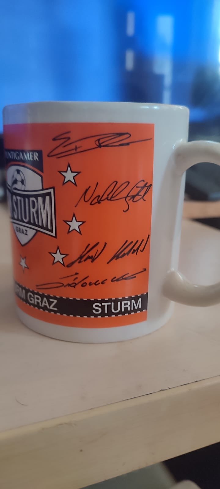 Bei diesem Häferl handelt es sich um ein Fundstück aus den 90er-Jahren mit den aufgedruckten Unterschriften der damaligen Sturmmannschaft.