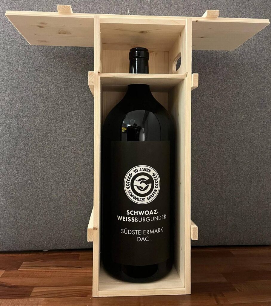 Zusätzlich zum „normalen“ Schwoaze Helfen-Wein des Weinguts Weber – welchen ihr HIER noch immer online erstehen könnt! – sponsort uns der hochdekorierte Winzer in diesem Jahr außerdem eine Magnumflasche seines Weins! Diese außergewöhnliche 5L-Flasche Sauvignon Blanc ist ein echtes Highlight für Genießer, Sammler und besondere Anlässe. Die beeindruckende Großflasche (Jeroboam) steht nicht nur für exzellenten Trinkgenuss, sondern auch für Gemeinschaft, Feierlichkeit und Genuss in großer Runde. Ob als Mittelpunkt eines Festes, als außergewöhnliches Geschenk oder als Sammlerstück – diese Flasche hinterlässt Eindruck. Ein besonderes Unikat – ersteigere dir Genuss im Großformat für den guten Zweck.