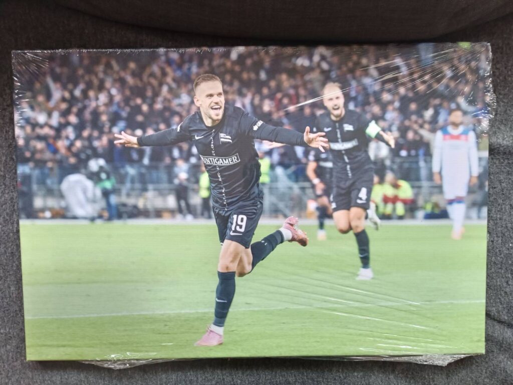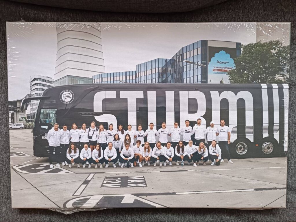 Zwei Leinwandbilder aus dem diesjährigen SturmTifo-Archiv wurden uns ebenfalls gespendet! Dabei handelt es sich einerseits um ein Mannschaftsfoto des erfolgreichen Frauenteams des SK Sturm auf ihrer Reise nach Amsterdam zur Europa League-Qualifikationsrunde gegen die Ajax Vrouwen. Das zweite Leinwandbild zeigt ein Foto unseres Mittelfeldtricksers Tomi Horvat bei seinem Torjubel gegen die Glasgow Rangers. Beide Leinwände gibt es in der Größe 60 cm x 40 cm. Vielen Dank an den Spender!
