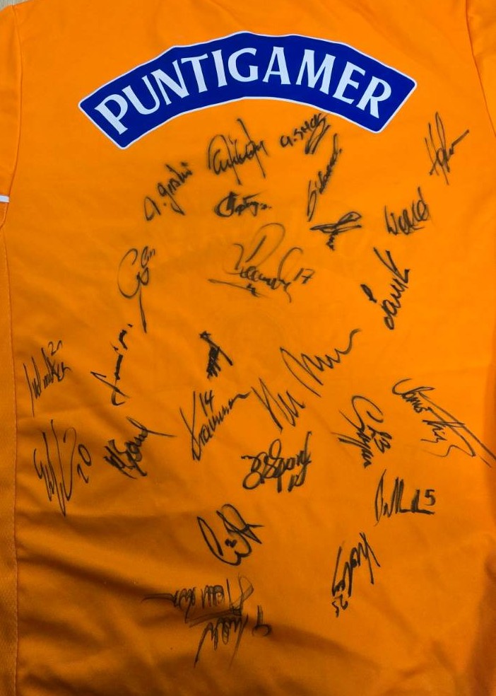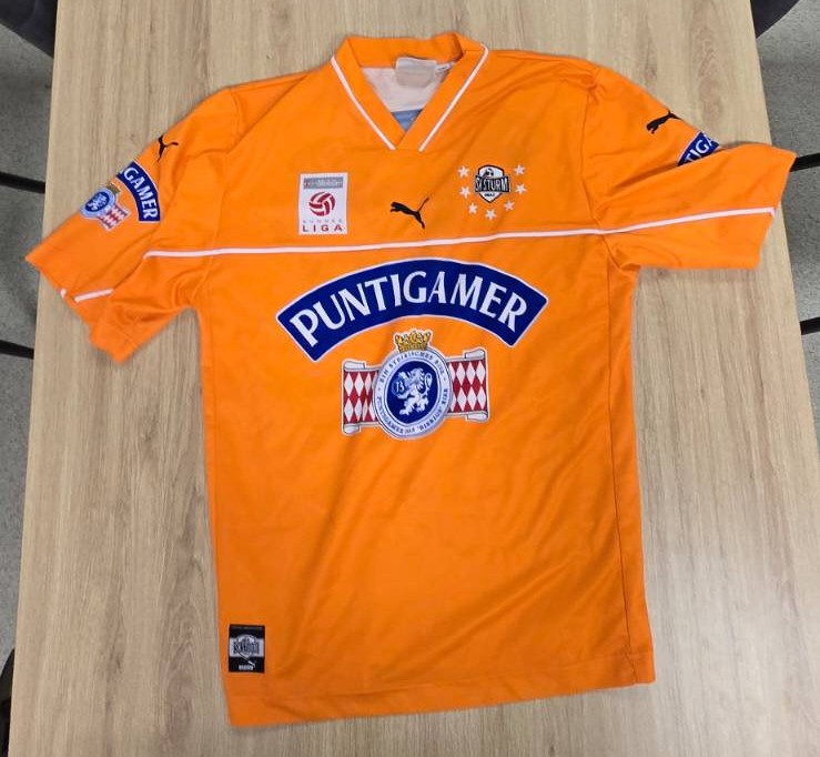 Schließlich haben wir noch zwei nicht eindeutig zuordenbare Trikots von unbekannten Spendern geschenkt bekommen, die beide mit einer stattlichen Anzahl an Unterschriften signiert sind! Es lohnt sich also allemal auf diese zu steigern! Bei den Größen handelt es sich um XL (oranges Trikot) und S (schwarz-weiß gestreiftes Trikot). Falls ihr die Trikots einer konkreten Jahreszahl zuordnen könnt, meldet euch bitte gern unter kontakt@schwoazehelfen.at. Ein großes Dankeschön ergeht jedenfalls an die Spender!