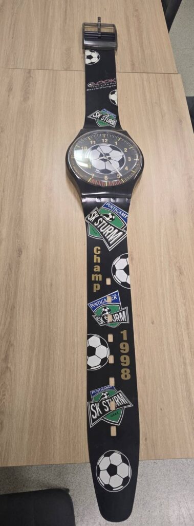 Das verrückteste Exemplar der 90er-Jahre folgt jedoch in den nächsten Zeilen. Eine SK Sturm-Armband-Wanduhr aus dem Jahr 1998 im legendären und kuriosen Champ-Design! Die Uhr funktioniert und hat eine Gesamthöhe von etwa 210 cm bei einer Breite von 30 cm. Leider ging beim unteren „Armband“ der Metallstab verloren, der den unteren Teil mit der Uhr verbindet. Dieses kleine Manko sollte sich jedoch relativ einfach reparieren lassen und spannend und kurios bleibt dieses seltsam tolle Unikat allemal!